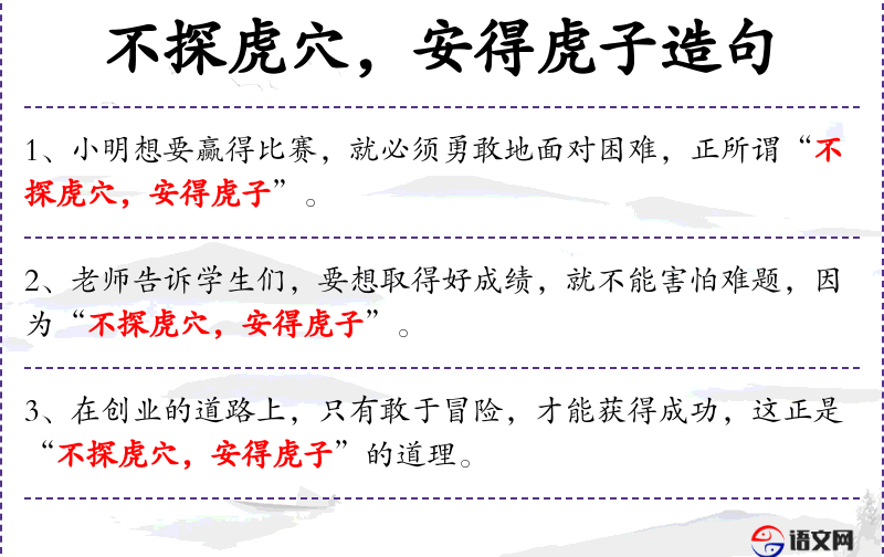 3. 【探虎穴】 - 比喻冒险。语本《后汉书.班超传》"不入虎穴,不得虎子。"