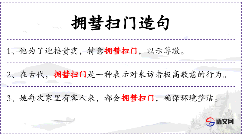 - 礼貌用语:“拥彗扫门”体现了对客人的尊重和欢迎