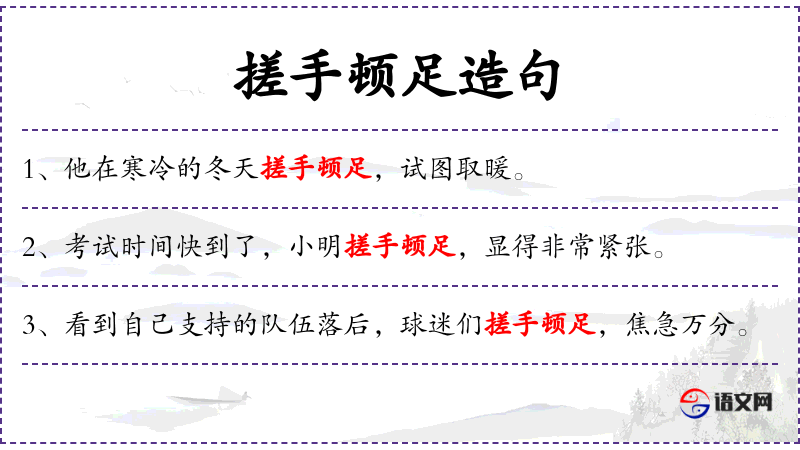 - 谓语:第一个分句的谓语是“看到”,第二个分句的谓语是“搓手顿足,焦急万分”。