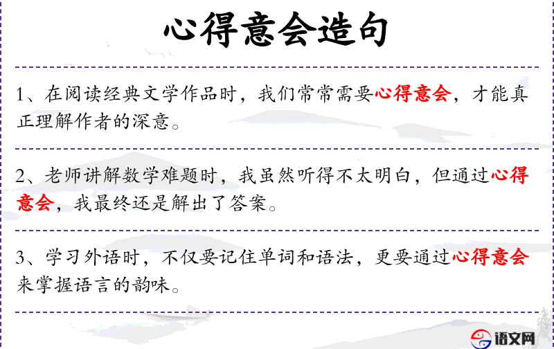 句子:“在哲学思考中,心得意会是一种重要的思维方式,它能帮助我们洞察事物的本质。”