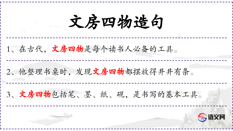 - 文房四物:指**传统文化中的笔、墨、纸、砚,是书写和绘画的基本工具。