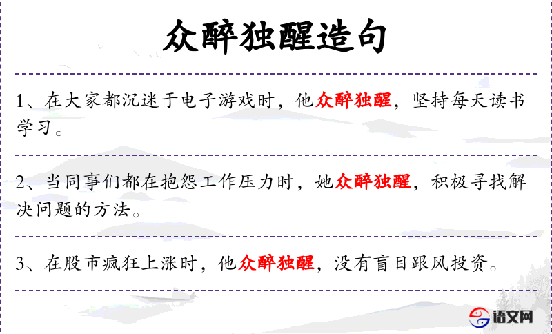 - “众醉独醒”是一个成语,源自《左传·宣公十五年》,比喻在众人沉迷时保持清醒。