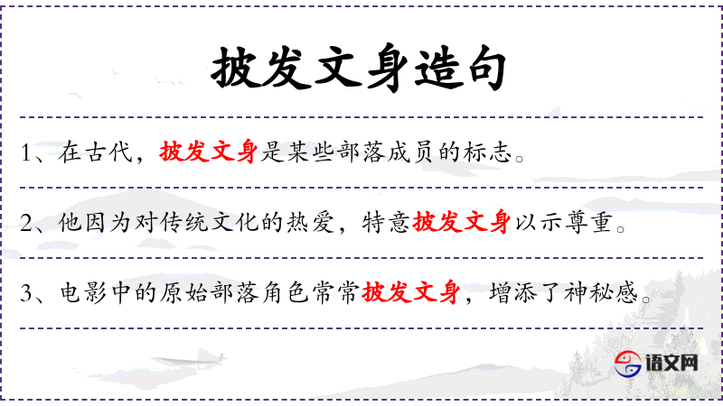 句子:“考古发现显示,古代某些民族有披发文身的传统。”