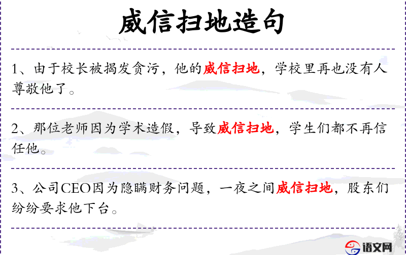 4. 【威信扫地】 威信:威望和信誉。威望、信誉全部丧失。比喻威望和信誉完全丧失。