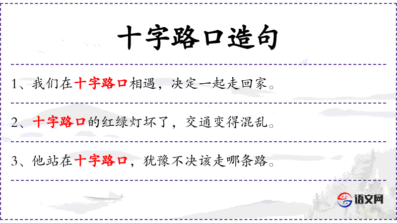 - 十字路口:名词,指两条或多条道路交叉的地方。