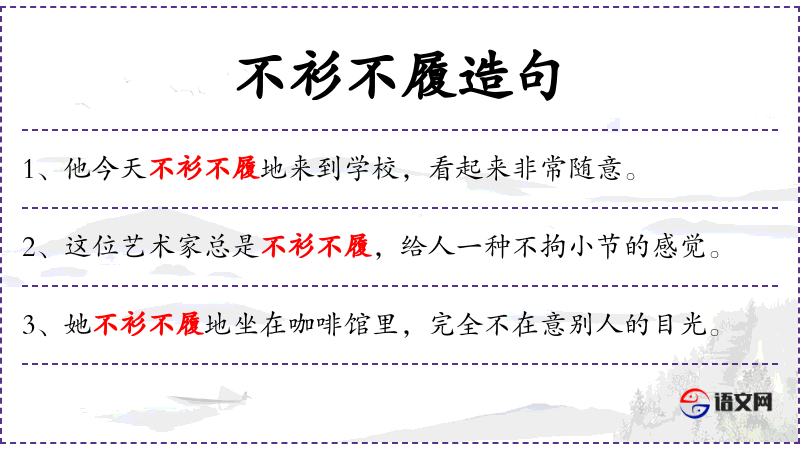 1. 【不衫不履】 - 衫:上衣;履:鞋子。不穿长衫,不穿鞋子。形容不修边幅的样子。