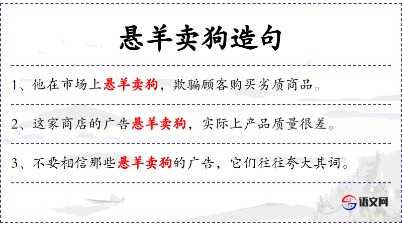 - 悬羊卖狗:这个成语来源于**古代,形象地描述了欺骗行为。