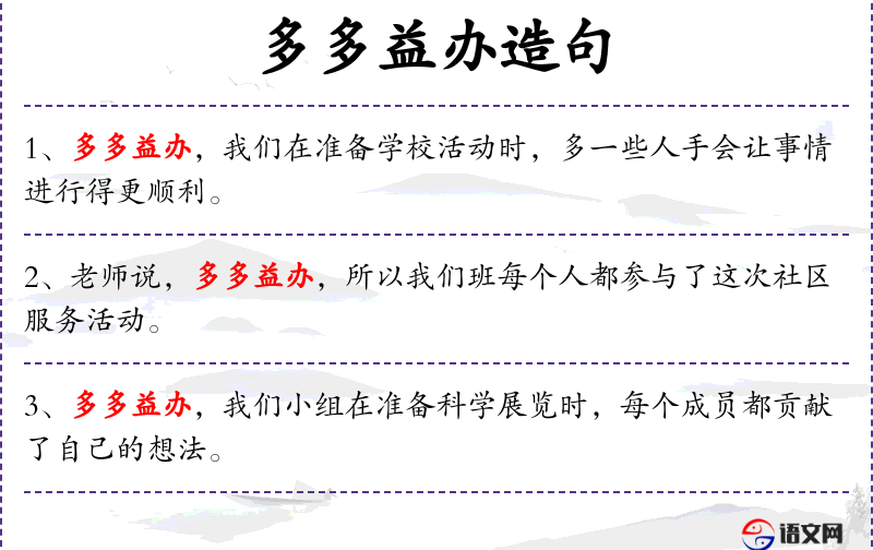 句子:“多多益办,我们在准备学校活动时,多一些人手会让事情进行得更顺利。”