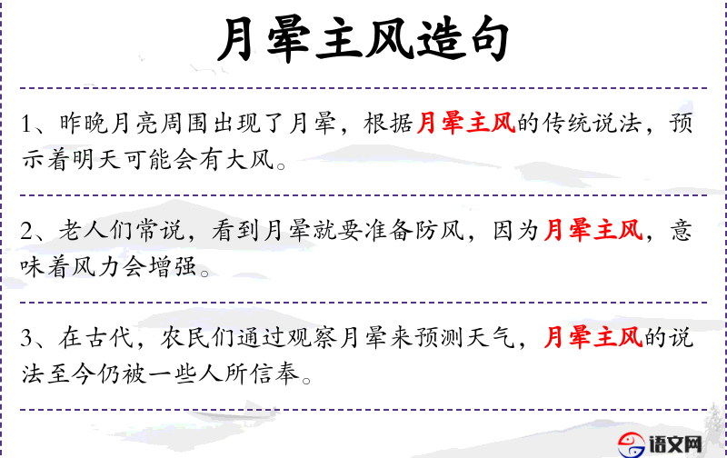1. 【月晕主风】 - 晕:日光或月光通过云层时因折射作用而形成日、月周围的光圈。月亮周围出现晕圈,则是有风的预兆