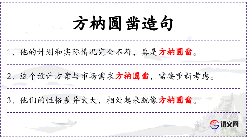 - 方枘圆凿:成语,比喻两者不相适应,格格不入。