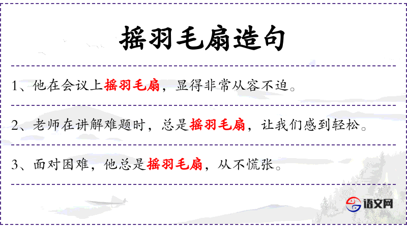 - 文化背景中,“摇羽毛扇”可能与**古代文人的形象有关,他们常用羽毛扇来表现自己的风度和智慧。