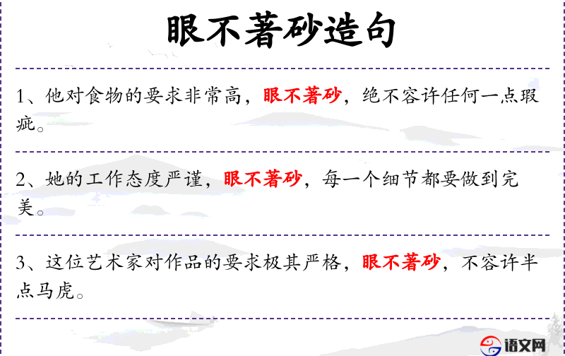4. 【眼不著砂】 著:同“着”,着落。眼睛里不能容一点沙子。指对坏人坏事不能容忍