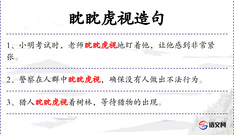 2. 【眈眈虎视】 - 眈眈:注视的样子。像老虎那样凶狠地盯着。