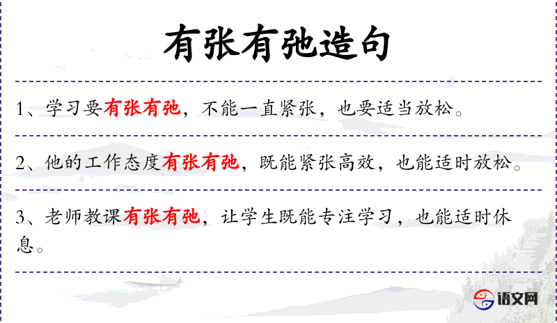 3. 【有张有弛】 意思是宽严相结合,是文王武王治理国家的方法。现用来比喻生活的松紧和工作的劳逸要合理安排。