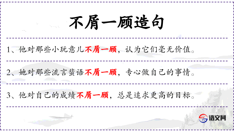 1. 【不屑一顾】 不屑:不值得,不愿意;顾:看。认为不值得一看。形容极端轻视。