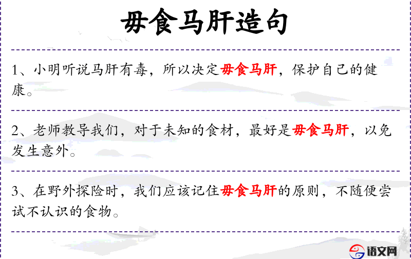 5. 【毋食马肝】 相传马肝有毒,食之能致人于死。比喻不应研讨的事不去研讨。