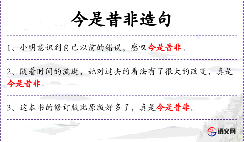- 今是昔非:成语,表示现在和过去不同,现在的情况比过去好。