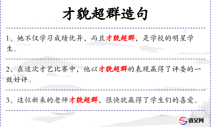 - 状语:在这次才艺比赛中,以才貌超群的表现