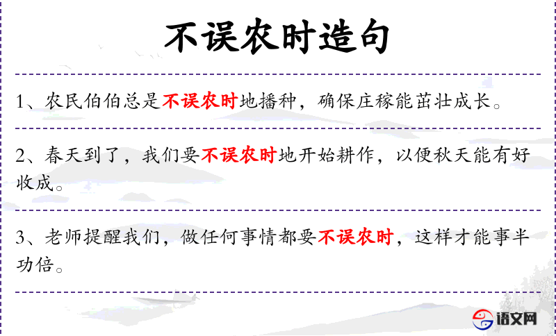 1. 【不误农时】 不耽误农作物的播种时节。