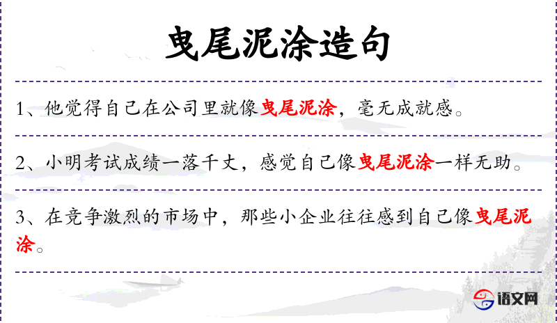 2. 【曳尾泥涂】 - ①比喻在污浊的环境里苟且偷生。同“曳尾涂中”。②比喻卑鄙龌龊的行为。