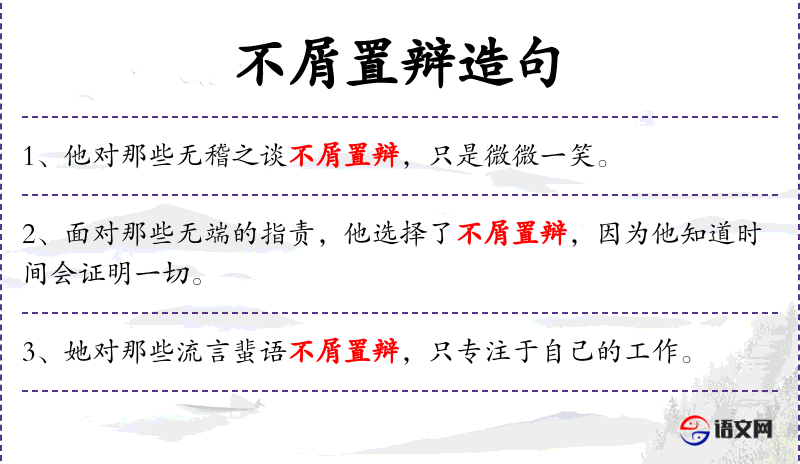 2. 【不屑置辩】 - 屑:认为值得;置辩:辩论,申辩。认为不值得分辩。