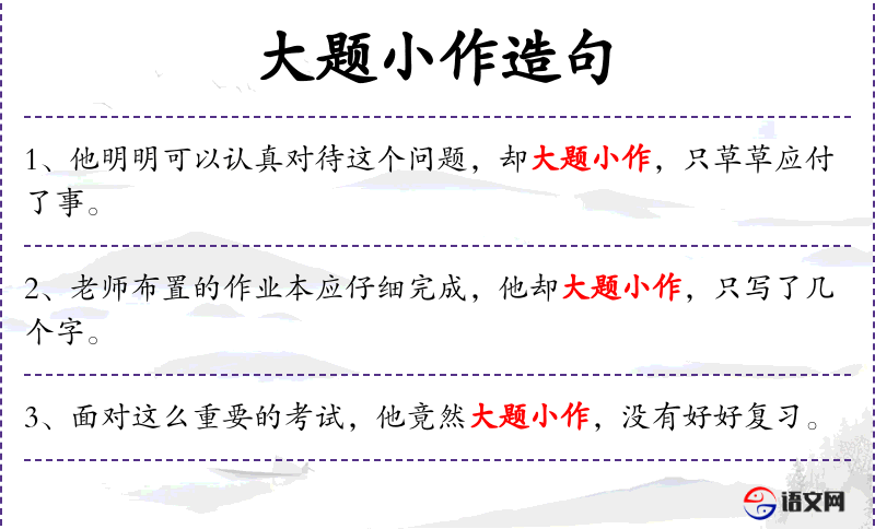 - 大题小作:成语,表示把重要的事情当作小事来处理。