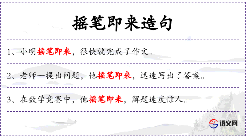 - 摇笔即来:形容作家写作迅速,灵感一来就能立即动笔。