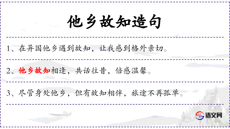 - 成语:“他乡遇故知”是一个成语,意指在异地遇到老朋友,感到非常高兴和安慰。