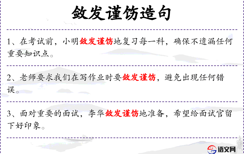 - 敛发谨饬:收敛行为,谨慎处理,形容行为谨慎小心。