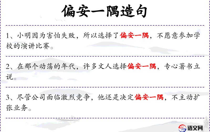 - 偏安一隅:指在某个角落安然生活,不问世事。