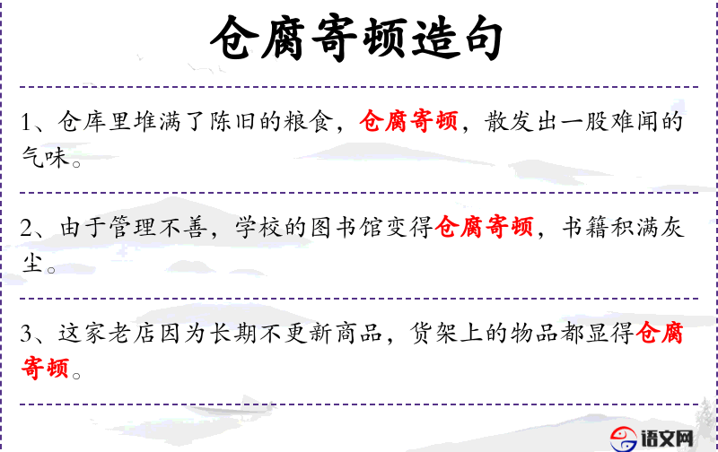 1. 【仓腐寄顿】 仓:仓库;腐:腐烂;寄顿:储存。仓库里储存的陈米已经腐烂。