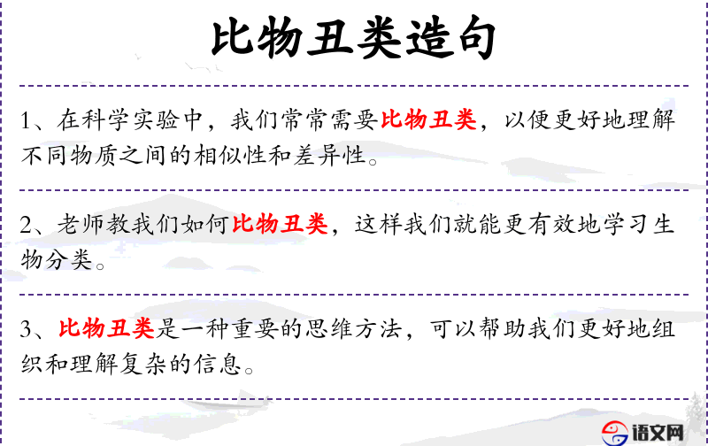 3. 【比物丑类】 - 指连缀同类事物,进行排比归纳。