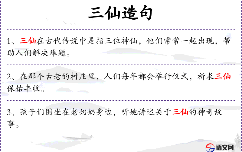 1. 【三仙】 传说三国吴主孙权之祖孙钟,以种瓜为业,有三仙人诣门乞瓜,钟厚待之。因指以葬地,谓当出天子。言讫化为三鹤飞去。事见《太平广记》卷三八九引《祥瑞记.孙钟》◇用为施瓜得福的典实; 指三位翰林学士。