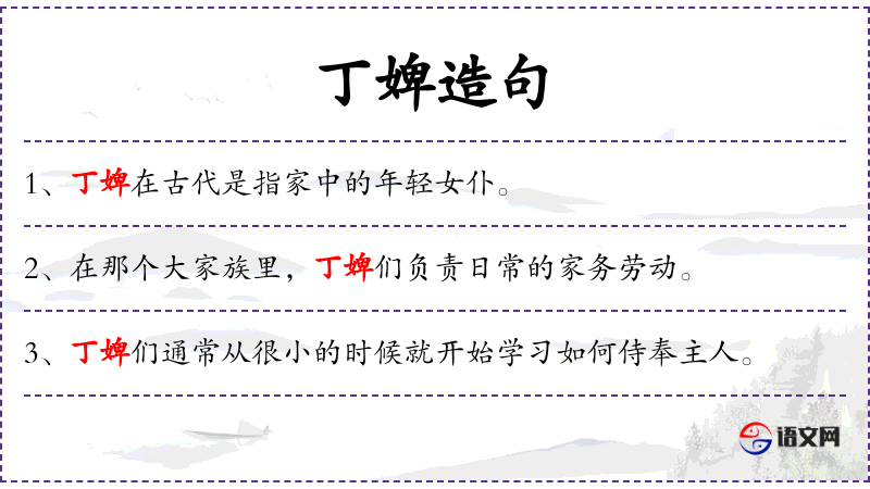 1. 【丁婢】 - 年龄在二十岁以上的成年婢女。