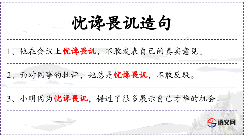 句子:“她因为忧馋畏讥,不敢在课堂上提问。”