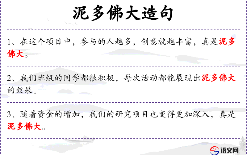 7. 【泥多佛大】 泥土越多,佛像就塑得越大。比喻底子厚或增加进来的多成就就大。