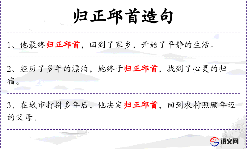 - 归正邱首:这个成语源自《左传·僖公二十五年》,原文是“归正邱首,不忘本也”,意为回到原来的地方,不忘本。
