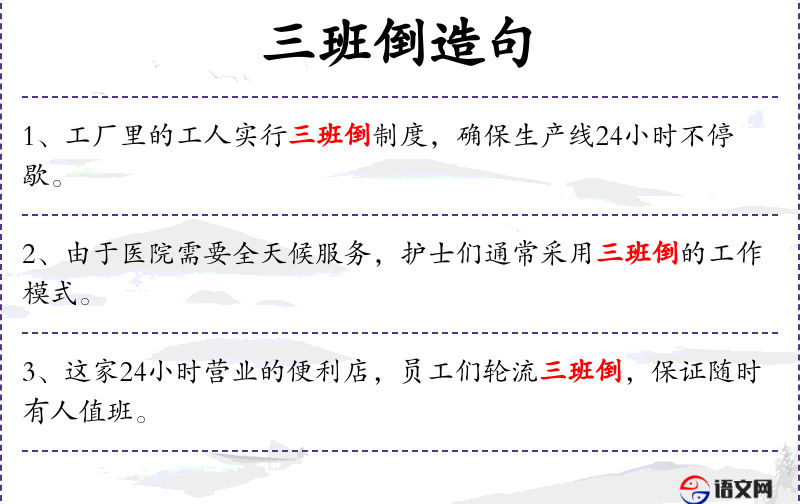 1. 【三班倒】 生产或其他工作上指早、中、夜三个班次轮流倒换(每班工作八小时)。