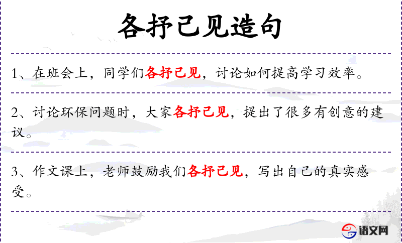 - 相关成语:各抒己见(每个人都有自己的看法)