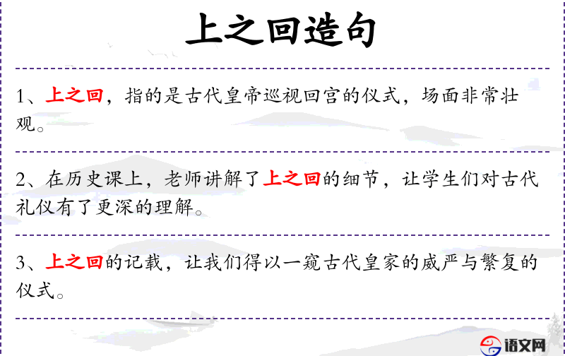 1. 【上之回】 乐府汉《铙歌》歌曲名。因首句'上之回'三字而得名。回,指回中宫,曾被匈奴烧毁,武帝元封四年,复通回中道,并数出游幸。歌辞当为赞美此事而作。参阅《乐府诗集》卷十六及唐吴兢《乐府古题要解》卷上。