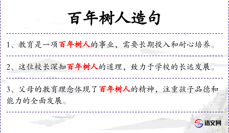 1. 【百年树人】 树:种植,栽培。比喻培养人才是长期而艰巨的事。