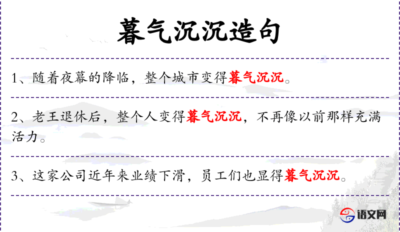 3. 【暮气沉沉】 - 暮气:黄昏时的烟霭;沉沉:低沉。形容精神萎靡不振,缺乏朝气。