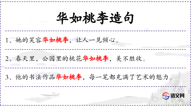 - 华如桃李:成语,形容事物美丽如桃花和李花。