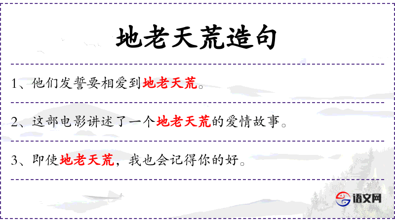 - 地老天荒:这个成语源自**古代文学,常用于形容爱情的坚贞不渝。