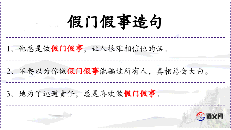 - 假门假事:形容虚假、不真实的行为。