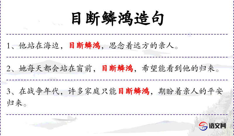 4. 【目断鳞鸿】 - 鳞鸿:鱼和雁,比喻书信。形容望眼欲穿,盼望书信到来。