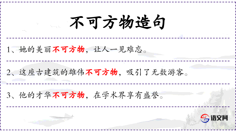 - 不可方物:形容事物非常美丽或出色,难以用言语形容。