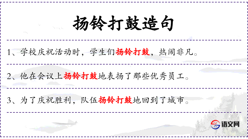 - 状语:为了宣传新书、扬铃打鼓地