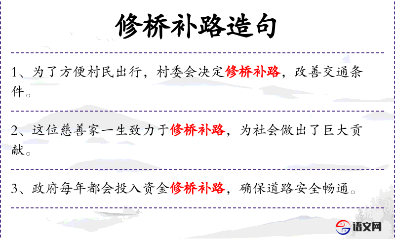 - 宾语:修桥补路,改善交通条件
