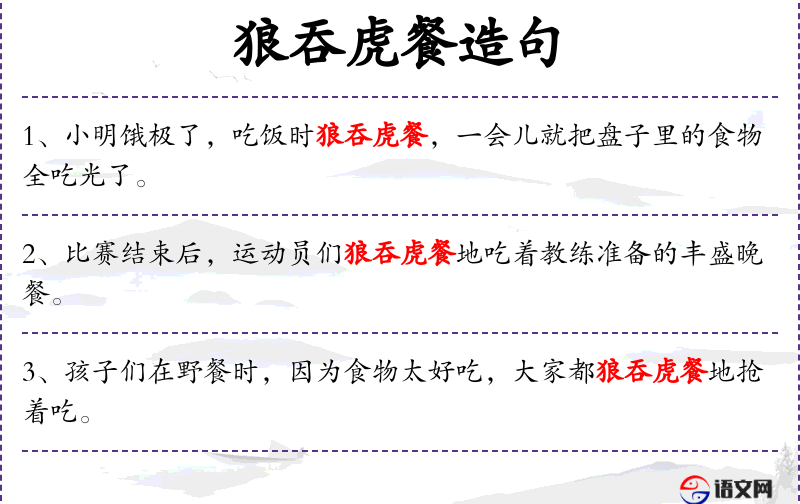 2. 【狼吞虎餐】 - 形容吃东西又猛又急。